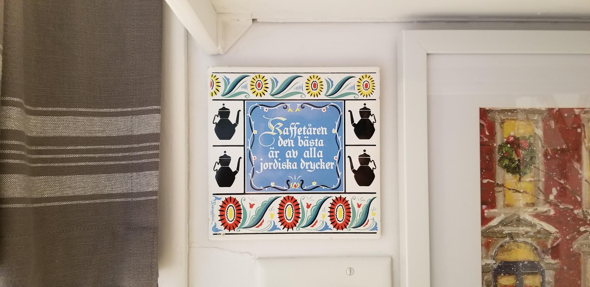 According to Google Translate, this decorative tile says, “The coffee maker is based on all earthly drinks.” I question its accuracy.